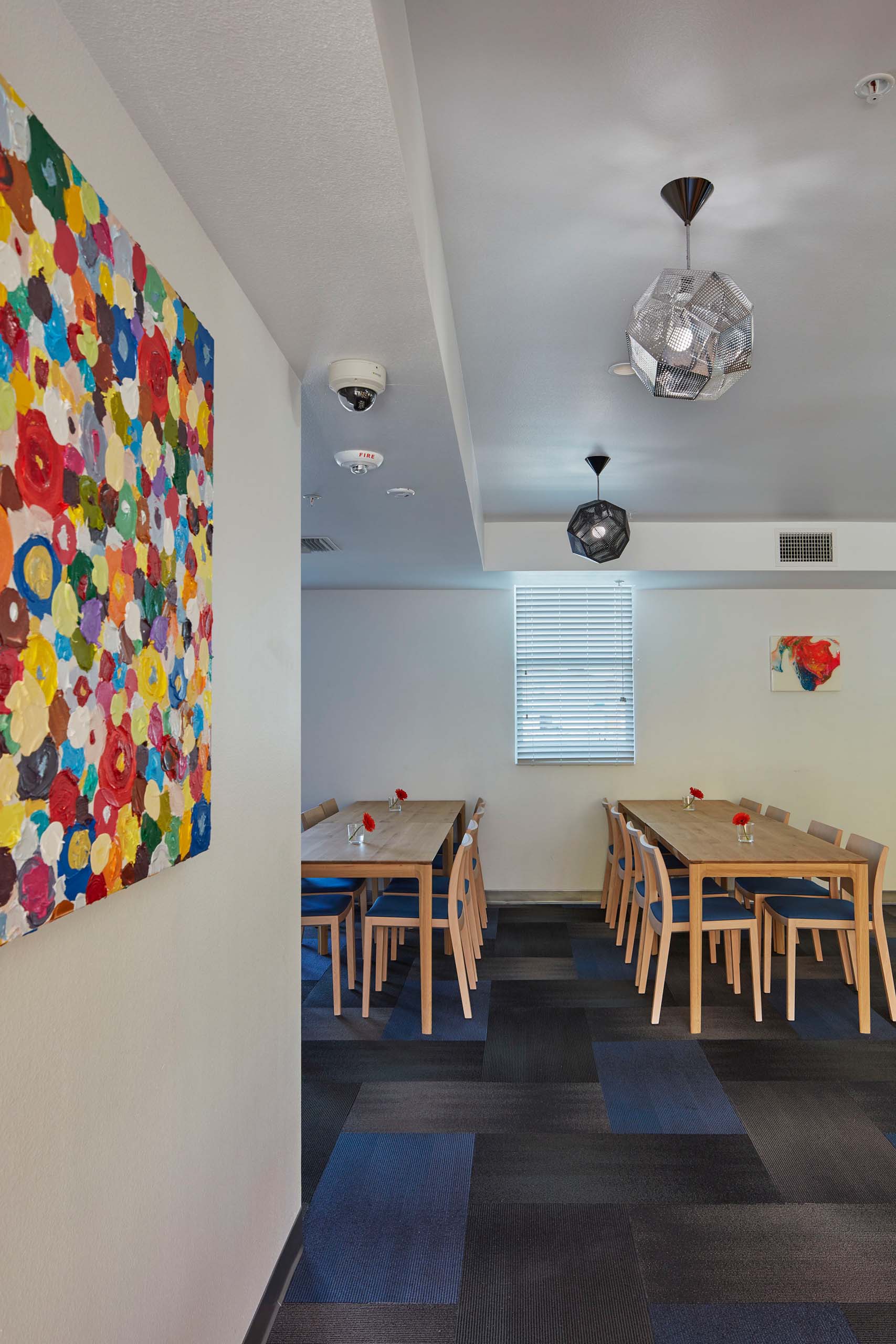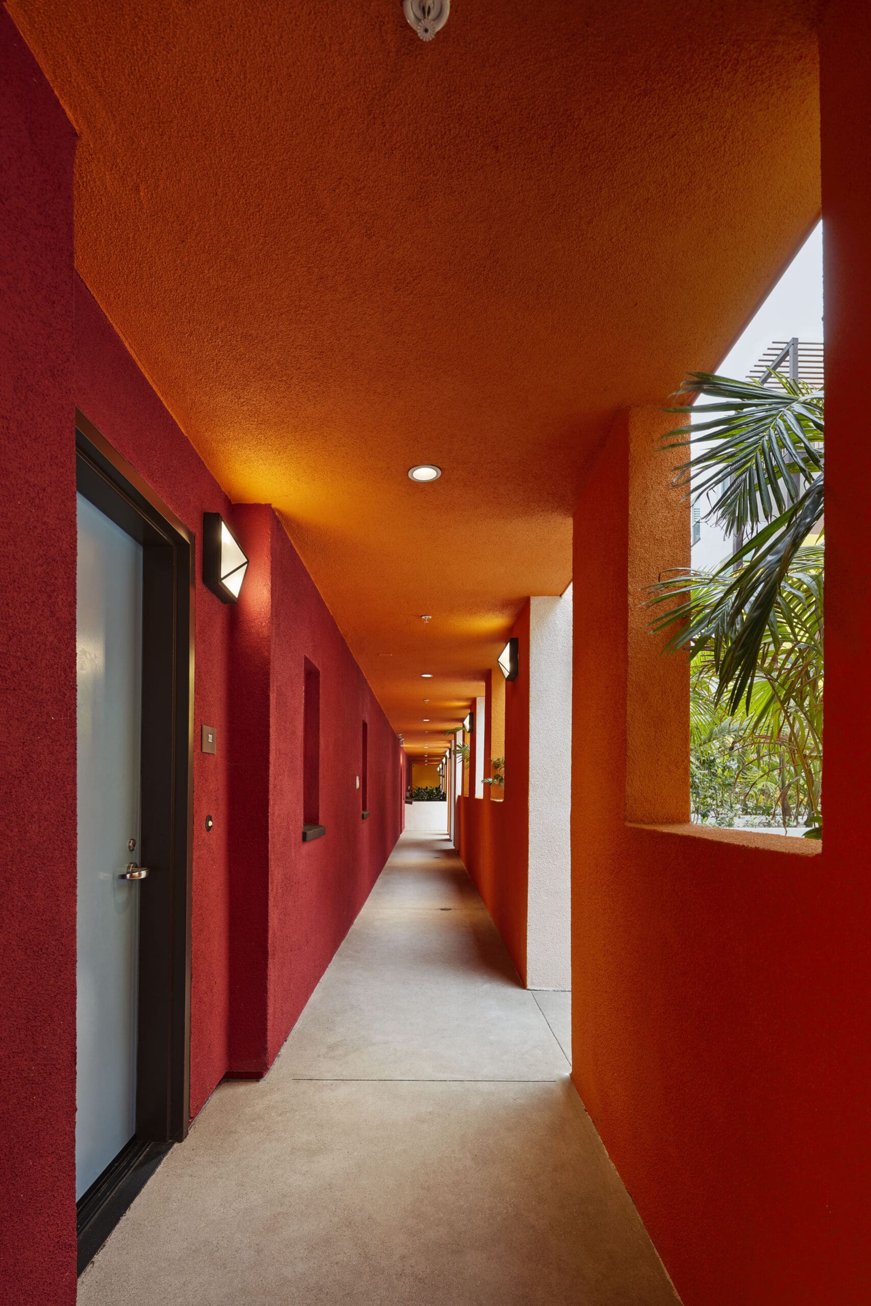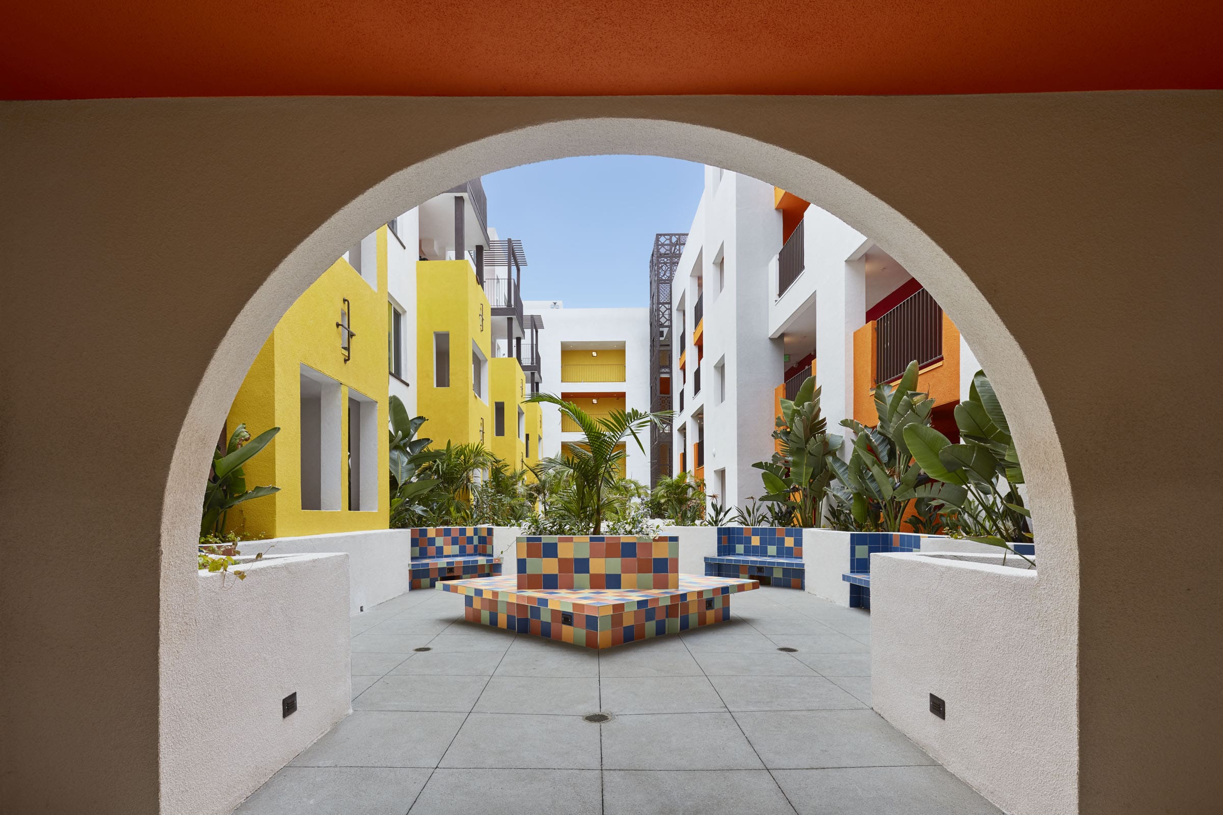 Solid white plaster massing, arched openings, a colorful central landscaped courtyard, and lush greenery evoke a sense of permanence, calm, and community within a transitional and heavily trafficked corridor.