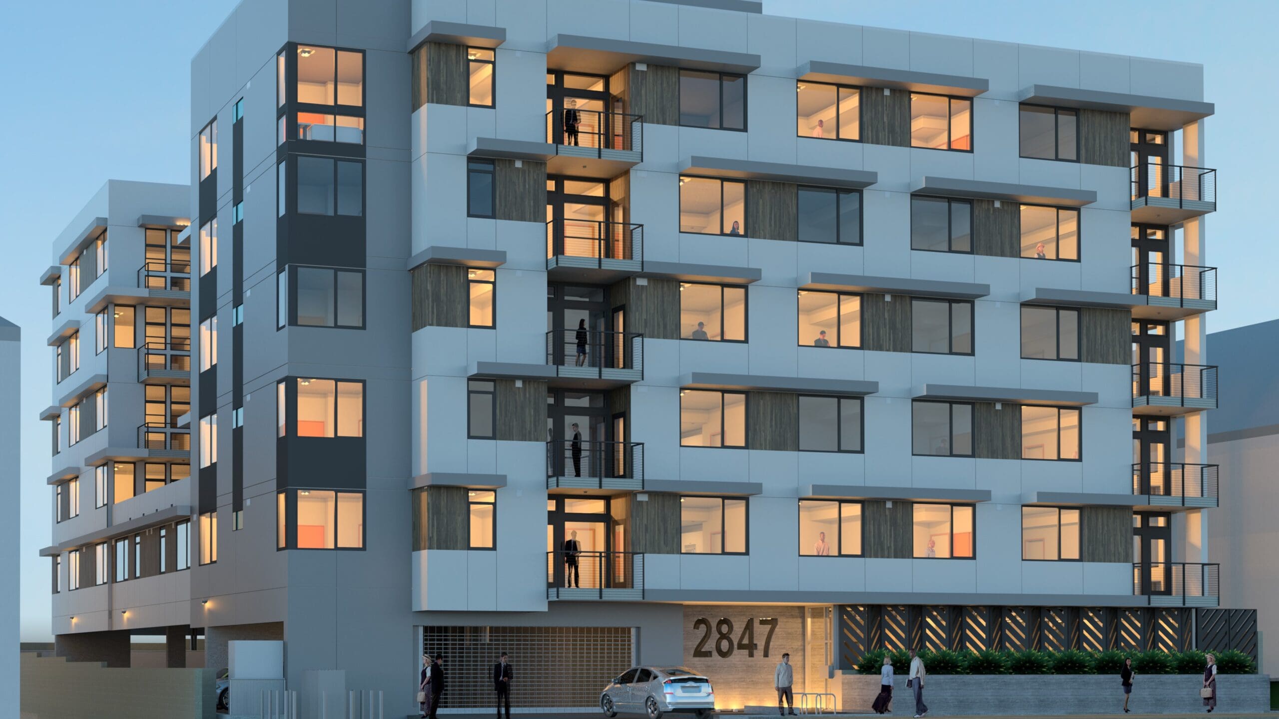 Leeward Apartments is a six-story, 46-unit market-rate condominium development located near Koreatown in Los Angeles. Designed for families, the completed project draws inspiration from traditional Korean motifs, articulated through a refined composition of horizontal projections, fenestration rhythms, and contrasting materials and colors that lend depth and visual movement to an otherwise planar façade.